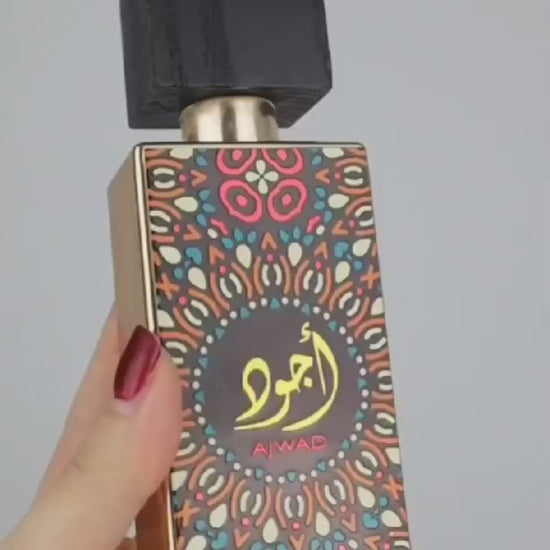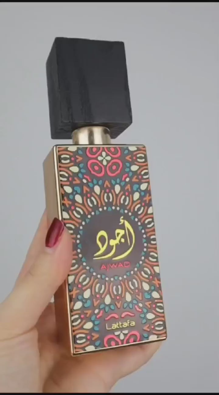 Ajwad de Lattafa Perfumes es una fragancia de la familia olfativa Amaderada Aromática para Hombres y Mujeres. Ajwad se lanzó en 2021. La Nota de Salida es notas afrutadas; las Notas de Corazón son rosa y jazmín; las Notas de Fondo son vainilla, almizcle, ámbar y cedro.
