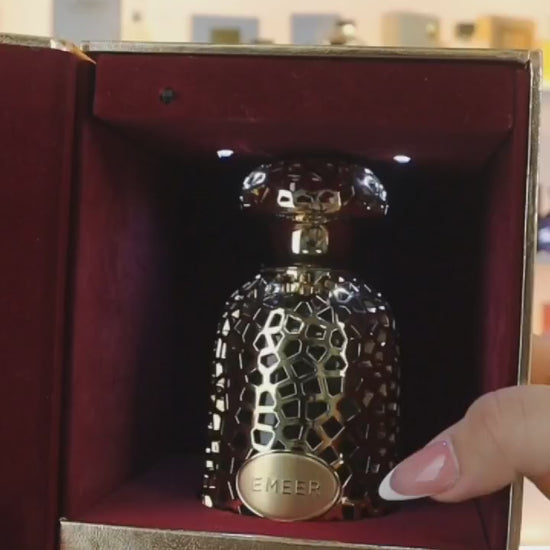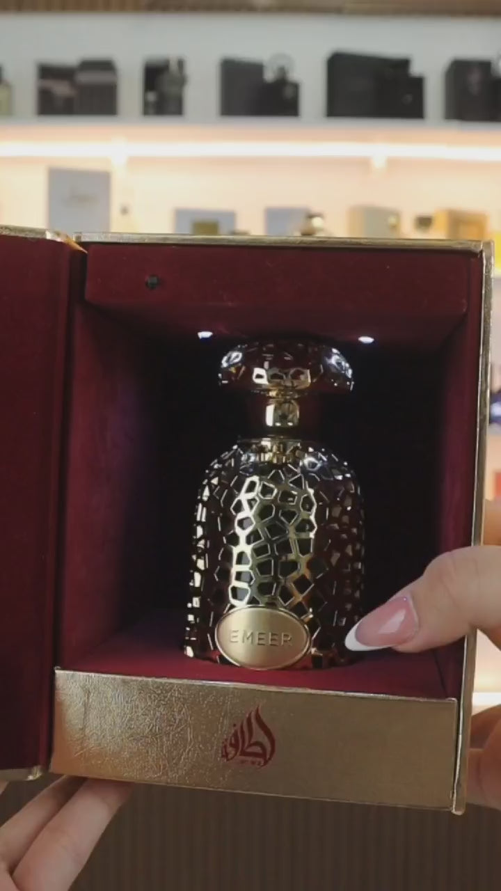 Emeer de Lattafa Perfumes es una fragancia de la familia olfativa Amaderada Aromática para Hombres y Mujeres. Esta fragrancia es nueva. Emeer se lanzó en 2024. Las Notas de Salida son limón (lima ácida), esclarea, bergamota y bayas de enebro; las Notas de Corazón son té Blanco, sándalo, cardamomo y incienso de olíbano (franquincienso); las Notas de Fondo son ámbar gris, cedro, cachemira y pachulí.